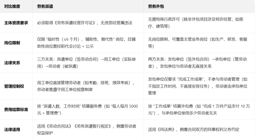 很多企业误以为 “把活儿交给第三方就是外包”,实则两者在法律关系、管理模式、责任承担上存在本质区别。根据《劳务派遣规范用工指引》,我们通过六大核心维度帮你快速区分: