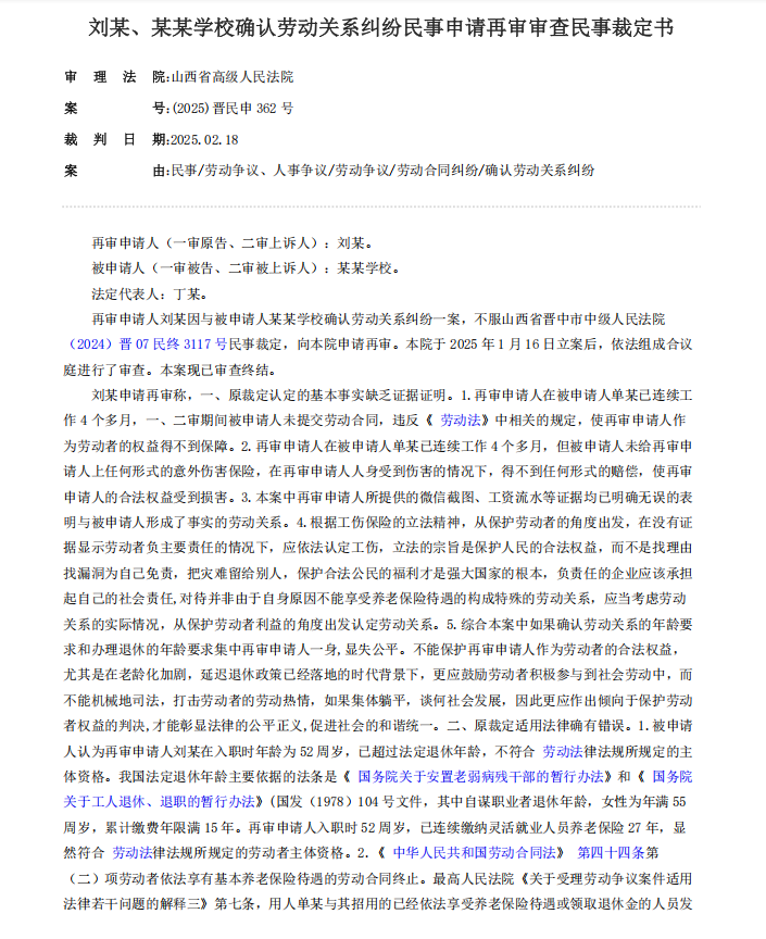 回到这起案件,劳动者入职时已年满 50 周岁,恰好达到女工人的法定退休年龄。哪怕她已缴纳 27 年社保,甚至符合灵活就业人员 55 岁退休的条件,法院仍以 “达到法定退休年龄” 为核心依据,认定她不具备建立劳动关系的主体资格 —— 这意味着,她和学校之间无法构成劳动关系,只能按劳务关系处理。