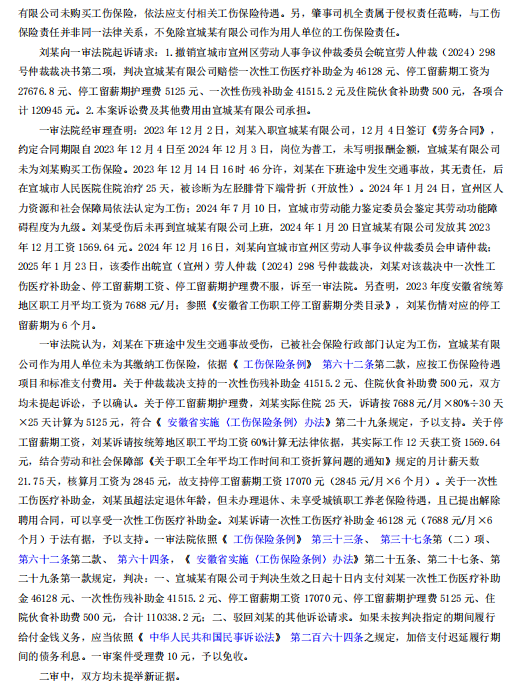 2024 年 12 月,她申请劳动仲裁,要求公司支付工伤待遇。2025 年 1 月,仲裁委出了裁决结果,但她对其中的一次性工伤医疗补助金、停工留薪期工资、停工留薪期护理费不服,于是向法院提起诉讼。