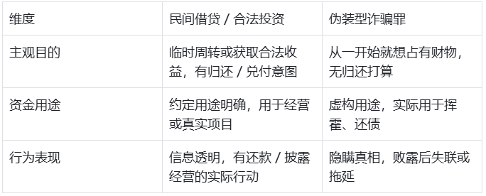 初始借款可能是民事纠纷,但当行为人开始 “虚构理由借新钱还旧债” 时,主观目的已转化为诈骗;