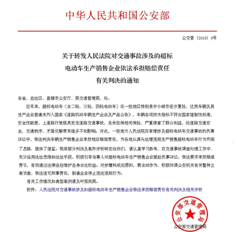 公安部也明确要求,各地在交通事故处理中,要引导当事人对超标电动车生产销售企业提起民事诉讼,依法维护自身权益,涉嫌犯罪的还要追究刑事责任。